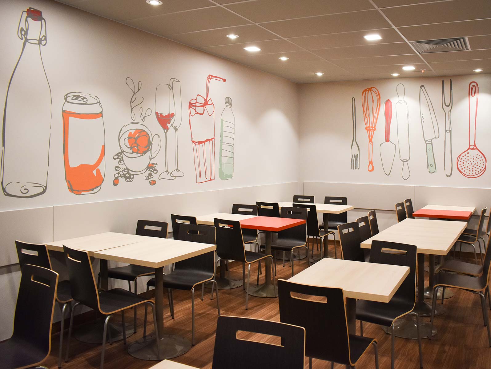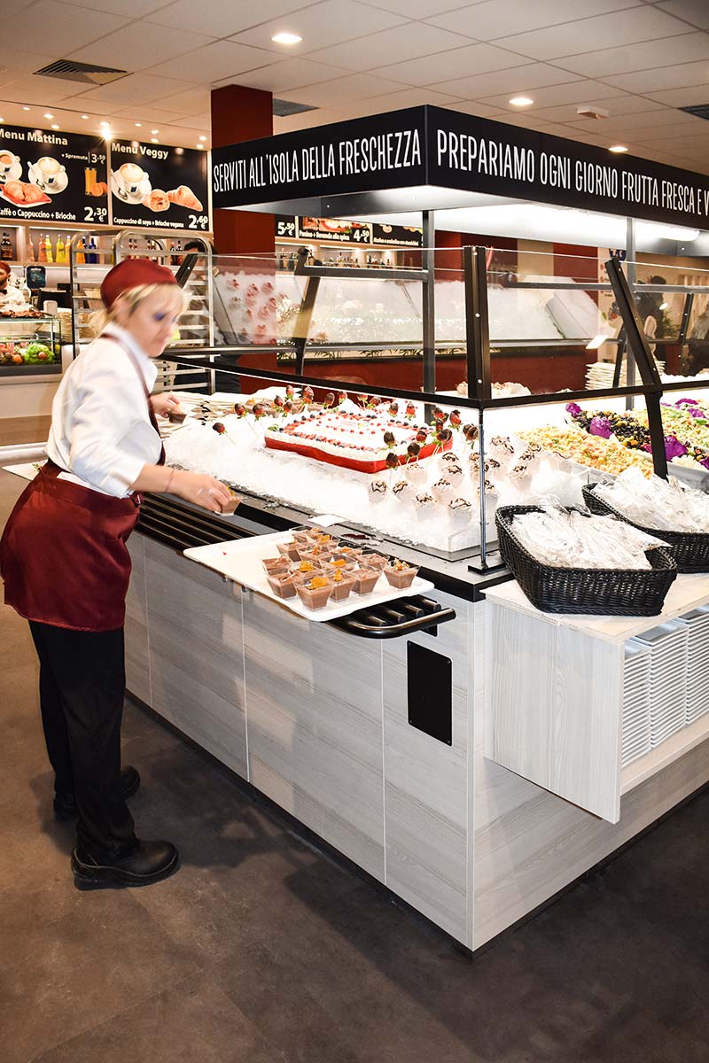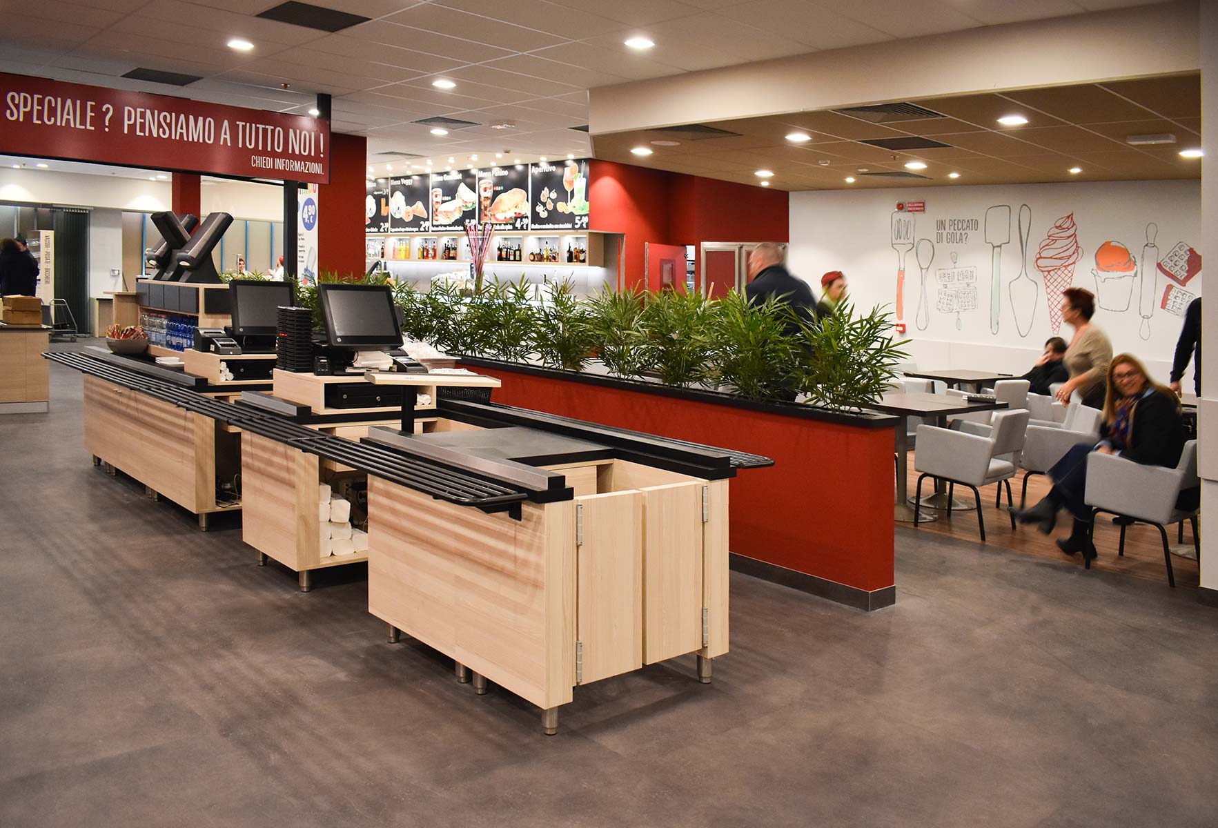 L’obiettivo: gestire più di mille coperti al giorno in modo agile ed all’interno di un ambiente funzionale ma allo stesso tempo accogliente e colorato. Abbiamo lavorato per molti mesi in maniera sinergica con un folto numero di artigiani e con il gruppo Flunch Italia nella progettazione, nel disegno e nella produzione di tutti gli arredi dei ristoranti della catena. Il risultato sono i locali di Torino, Genova, Roma, Novate, Collegno e Bari: luoghi in cui grazie alle luci, i colori, le grafiche e i materiali viene esaltato il buon cibo italiano, genuino come a casa.